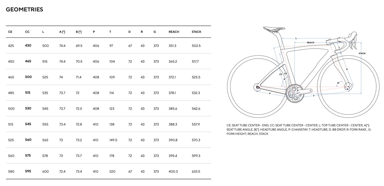 Dolžina sedežne cevi (CE) znaša 500 mm, dolžina sedežne cevi center–center (CC) 530 mm, dolžina zgornje cevi (L) 545 mm. Kot sedežne cevi (A) je 73,7 stopinje, kot krmilne cevi (B) 72,5 stopinje. Dolžina zadnjih vilic oz. chainstay (P) je 408 mm, dolžina krmilne cevi (T) 123 mm, BB drop (D) 72 mm. Zamik vilic (R) znaša 43 mm, višina vilic (G) 373 mm. Reach meri 385,6 mm, stack pa 542,6 mm.