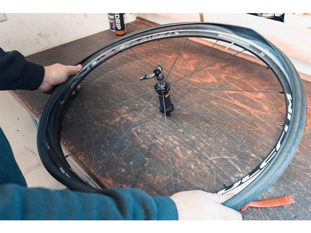 8.) Ko je celotna zračnica v kanalu je pomembno, da začnemo z zatikanjem drugega dela plašča (gume) pri ventilu