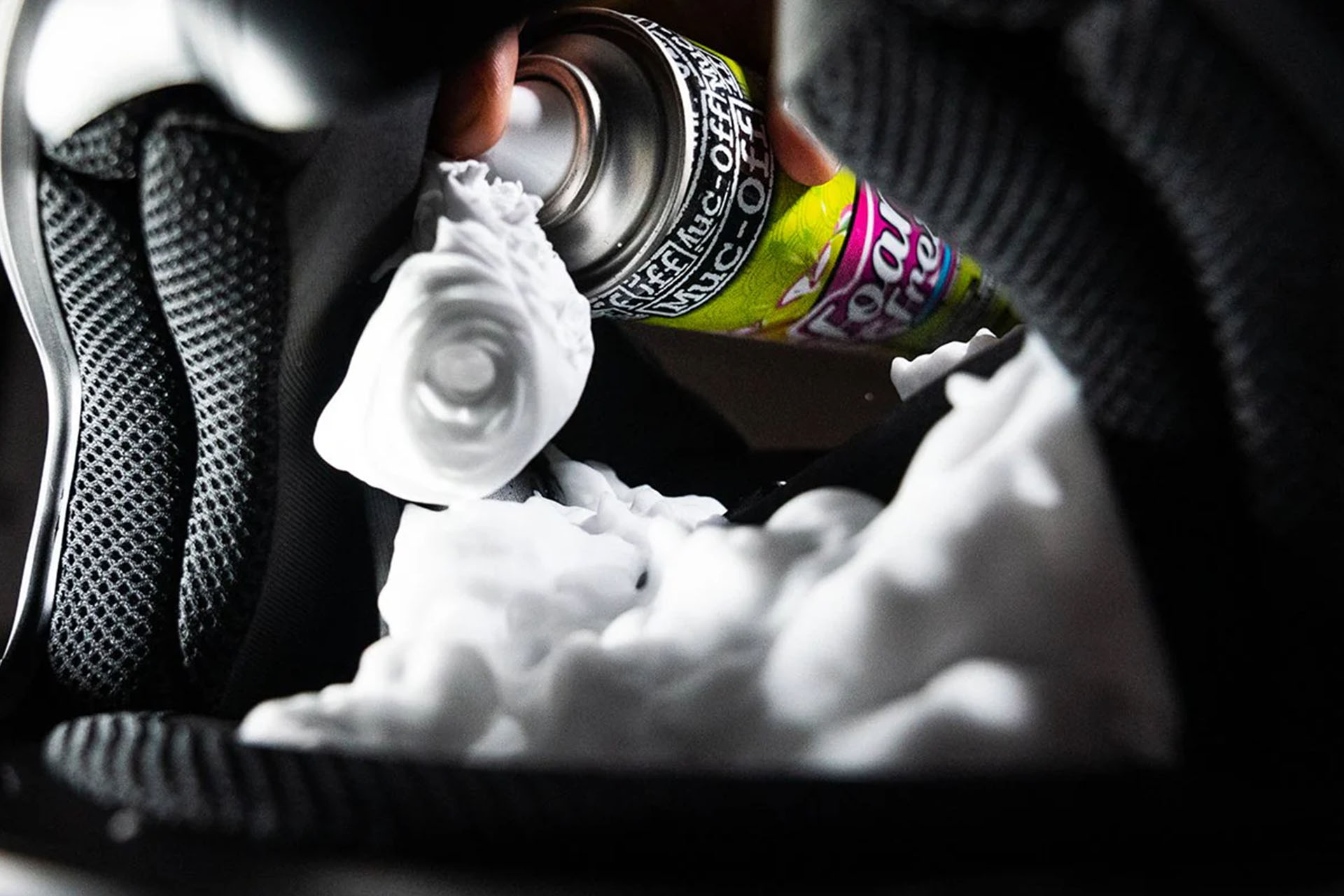 Čelade: Uporabite penasti čistilec, na primer Muc-Off Foam Cleaner. Nanesite čistilec po notranjosti in zunanji lupini čelade, pustite delovati nekaj minut in nežno obrišite z mehko krpo ali gobico. Nato čelado obesite, da se posuši na zraku. Ne uporabljajte sušilnega stroja ali močnega drgnjenja, da ne poškodujete pene ali zaščitnih materialov.